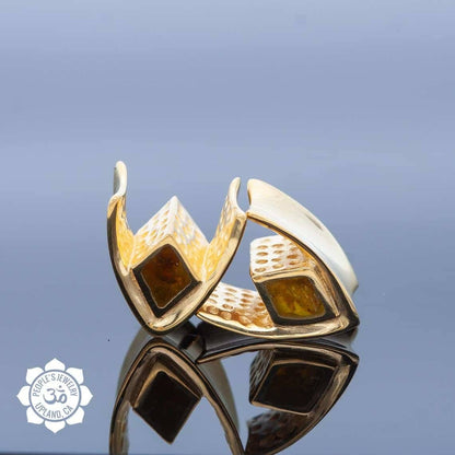 These 18kt Gold Plated Saddle Spreaders with Fossilized Bone or Reconstituted Amber are made from brass and feature an 18k Gold Plating. Adorned with Fossilized Bone or Reconstituted Amber, These come available in 2 different shapes, Diamond and Teardrop.