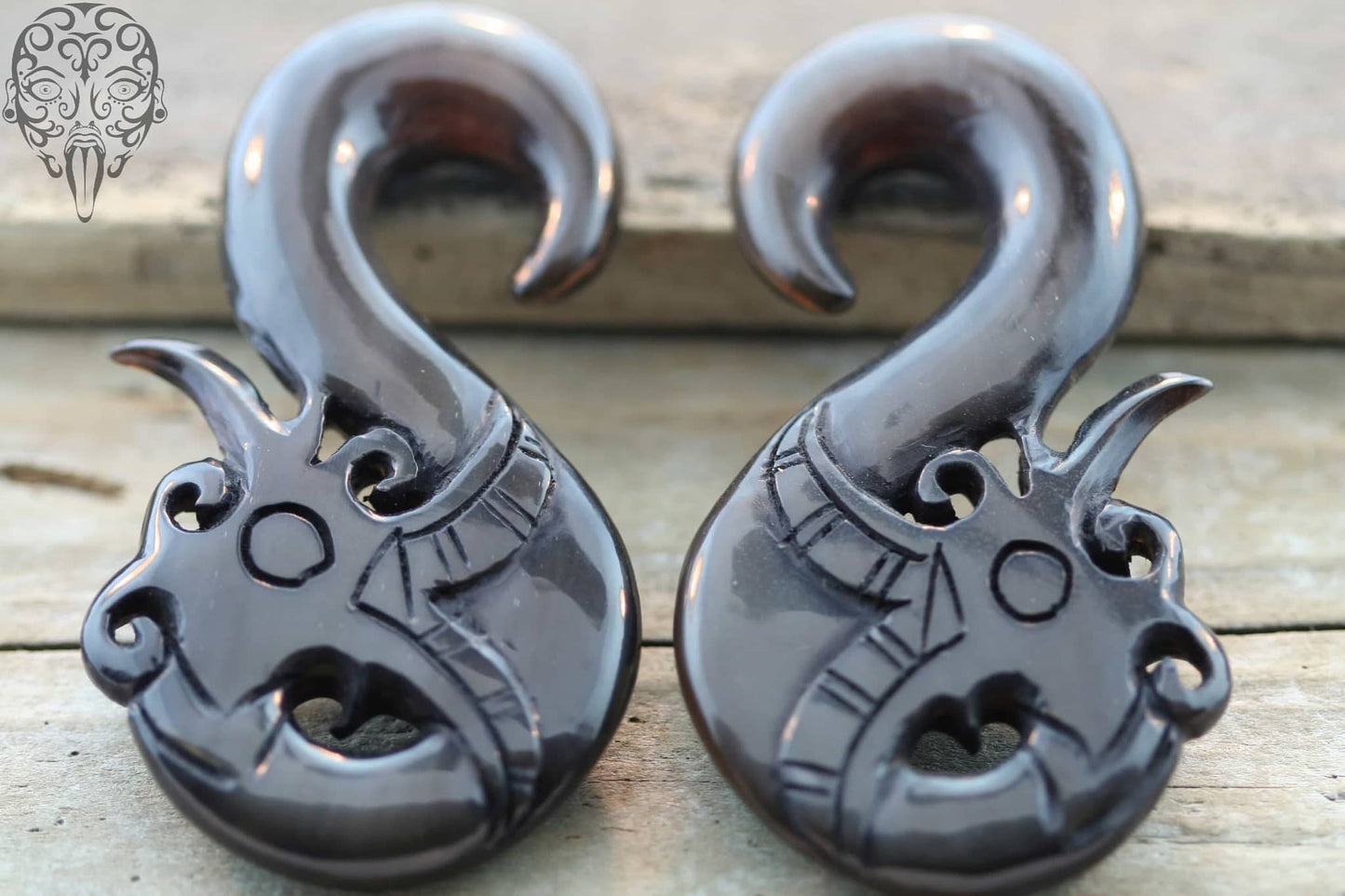 Crafted from Ethically Collected and Sourced Organic Water Buffalo Horn, These Borneo inspired "Aso" Dragons by Peoples Jewelry are available in Black Water Buffalo Horn and in sizes ranging from 12g (2mm) up to 7/16" (11mm).