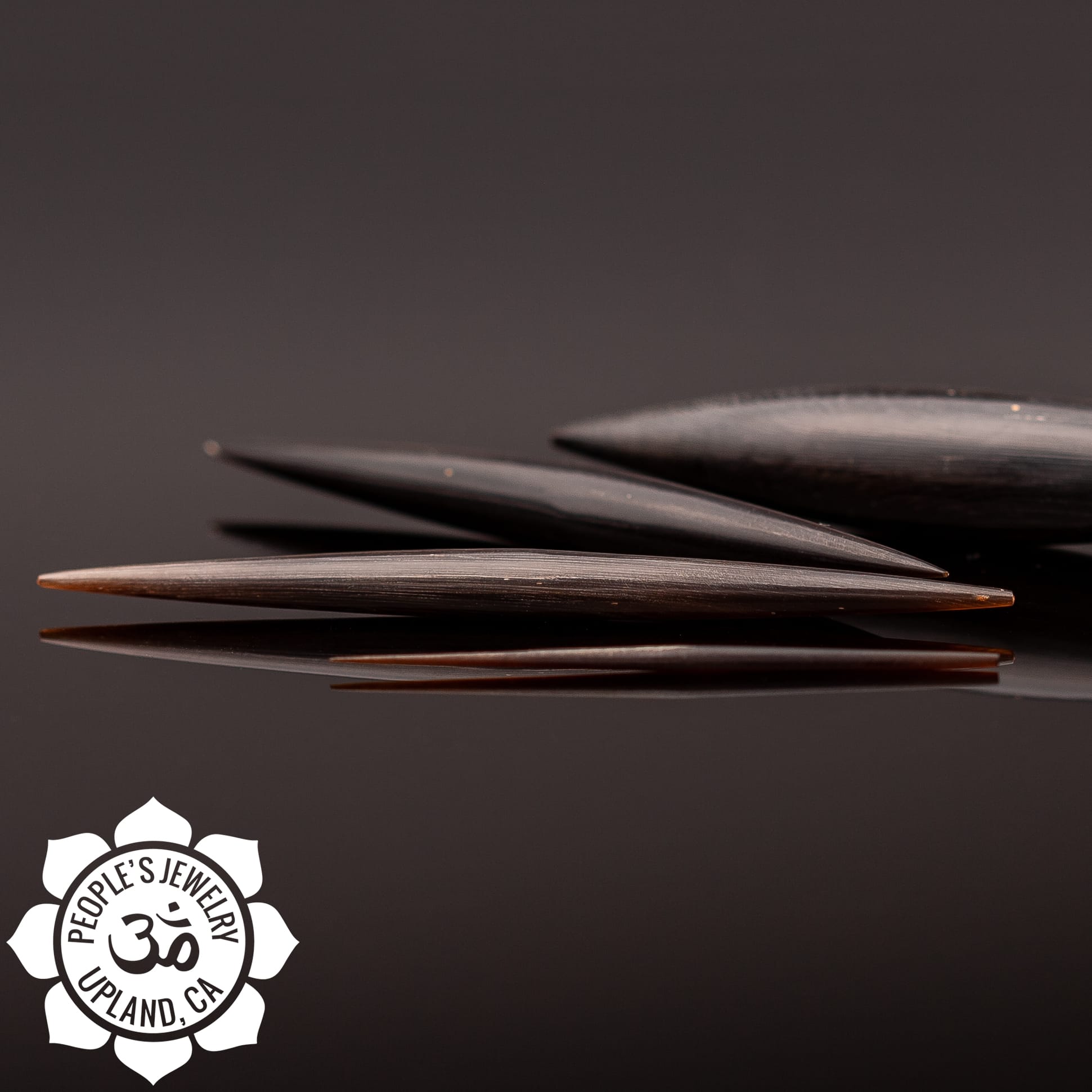 Enhance your edgy look with our Water Buffalo Horn Septum Spikes by Peoples Jewelry. Hand-carved from ethically collected and sourced water buffalo horn, these spikes are a unique addition to your collection. Available from 18g (1mm) - 00g (10mm). Overall length is approximately. 2". Due to the nature of the material, coloring and hues may vary.