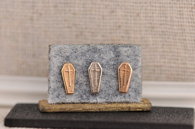 These Coffin ends from Local Natives Jewelry are hand-made in Solid 14k Yellow, White and Rose Gold. They feature a Stainless Steel Universal Threadless Pin.