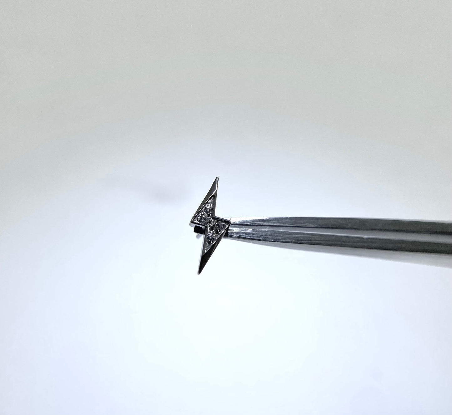 Threadless Titanium Gemmed Bolt is 10mm L x 4mm W (at its widest point) and includes 4 round 1mm clear cz's.