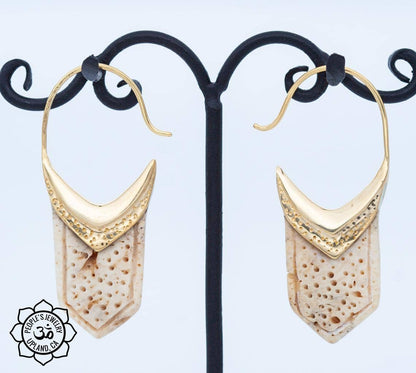 Expertly crafted from fossilized bone and adorned with 18k gold plating over Brass, these Dagger Earrings offer both elegance and durability.
