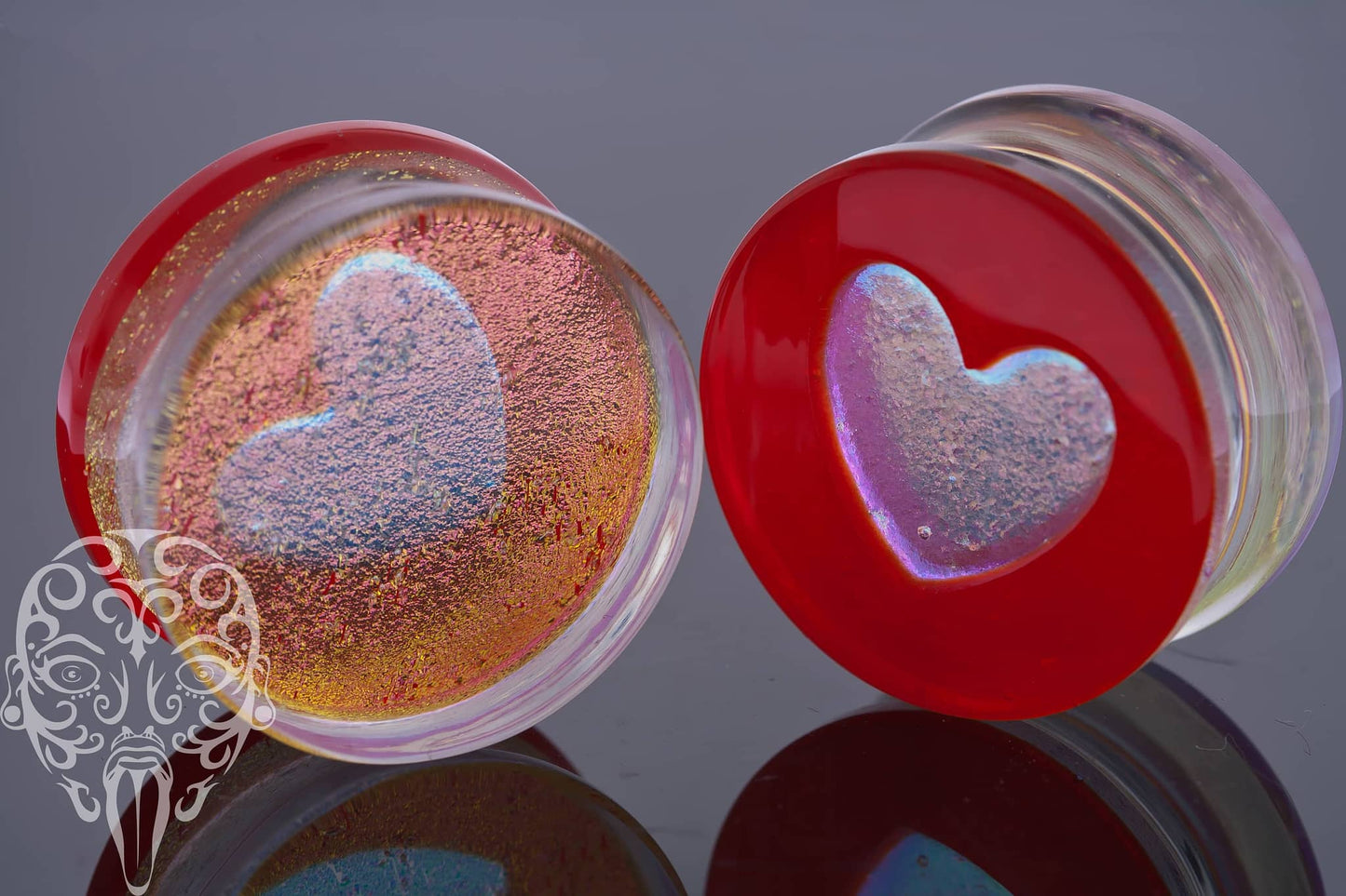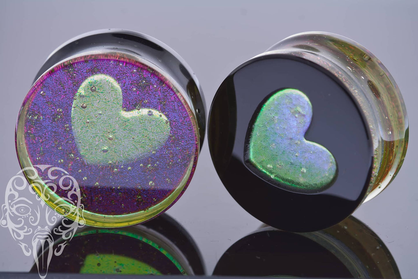 These Dichroic Lovesick Plugs from Gorilla Glass and Handmade from Borosilicate glass feature a dichroic heart design in the center of the plugs. Very limited stock remaining.
