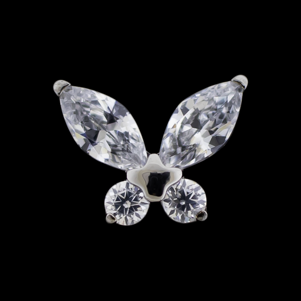 Elevate your style effortlessly with our prong-set cubic zirconia butterfly replacement end. This sparkling and charming accessory is perfect for belly rings, ear curations and more, adding a touch of whimsy to your look. Experience sophistication and exclusivity every time you wear this eye-catching piece. Each marquise cut gemstones measure 4mm x 2mm and each round gemstones measure 1.5mm. The entire piece measures 6.6mm x 5.1mm.