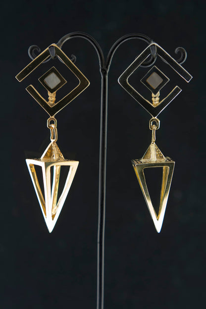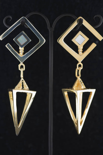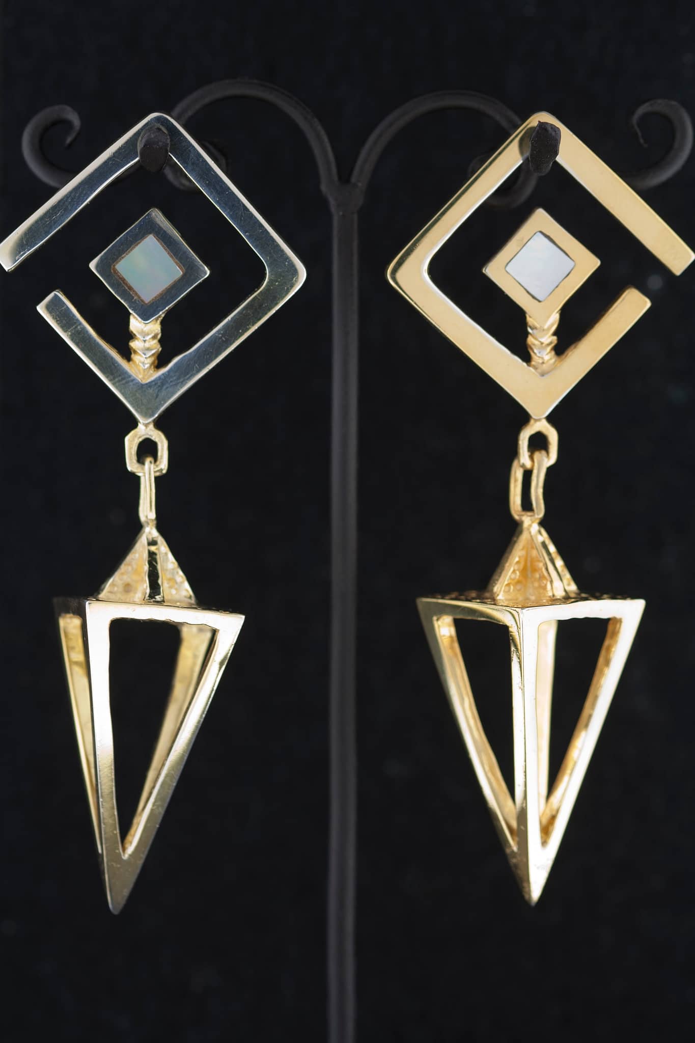 One-of-a-kind Gold Plated Cage Pointers, with a stunning Mother of Pearl shell. This design is sure to make a statement. Don't miss out on the limited stock of this discontinued item. Add a touch of elegance to any outfit with these unique cage pointers.