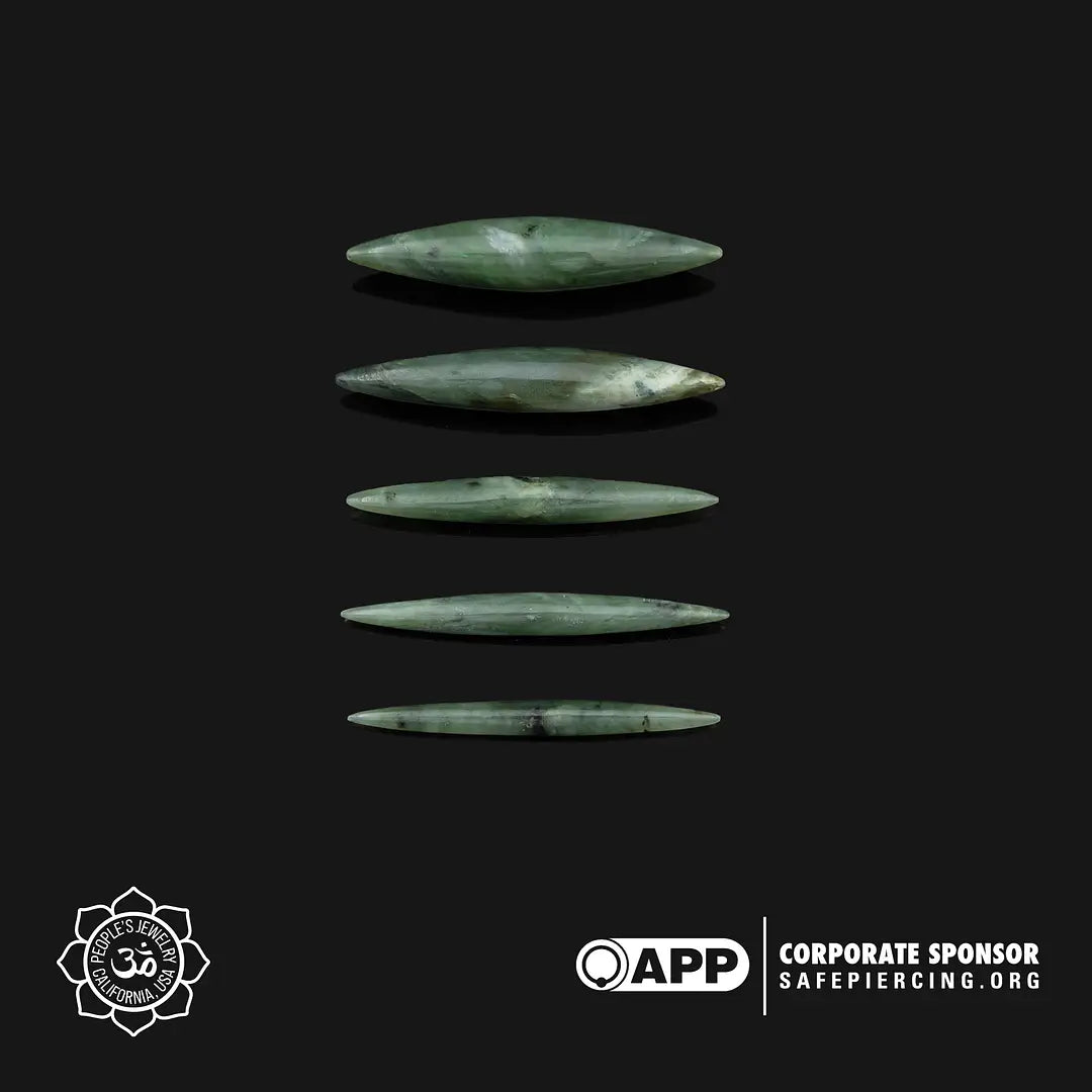 These Green Jade Septum Spikes by People’s Jewelry are Hand-Carved from Genuine Green Nephrite Jade. Available in sizes from 4.5mm up to 00g (10mm).