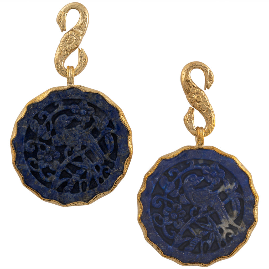 These Lapis Discs from Diablo Organics feature an ornate bird carving and are attached to brass bird accents.