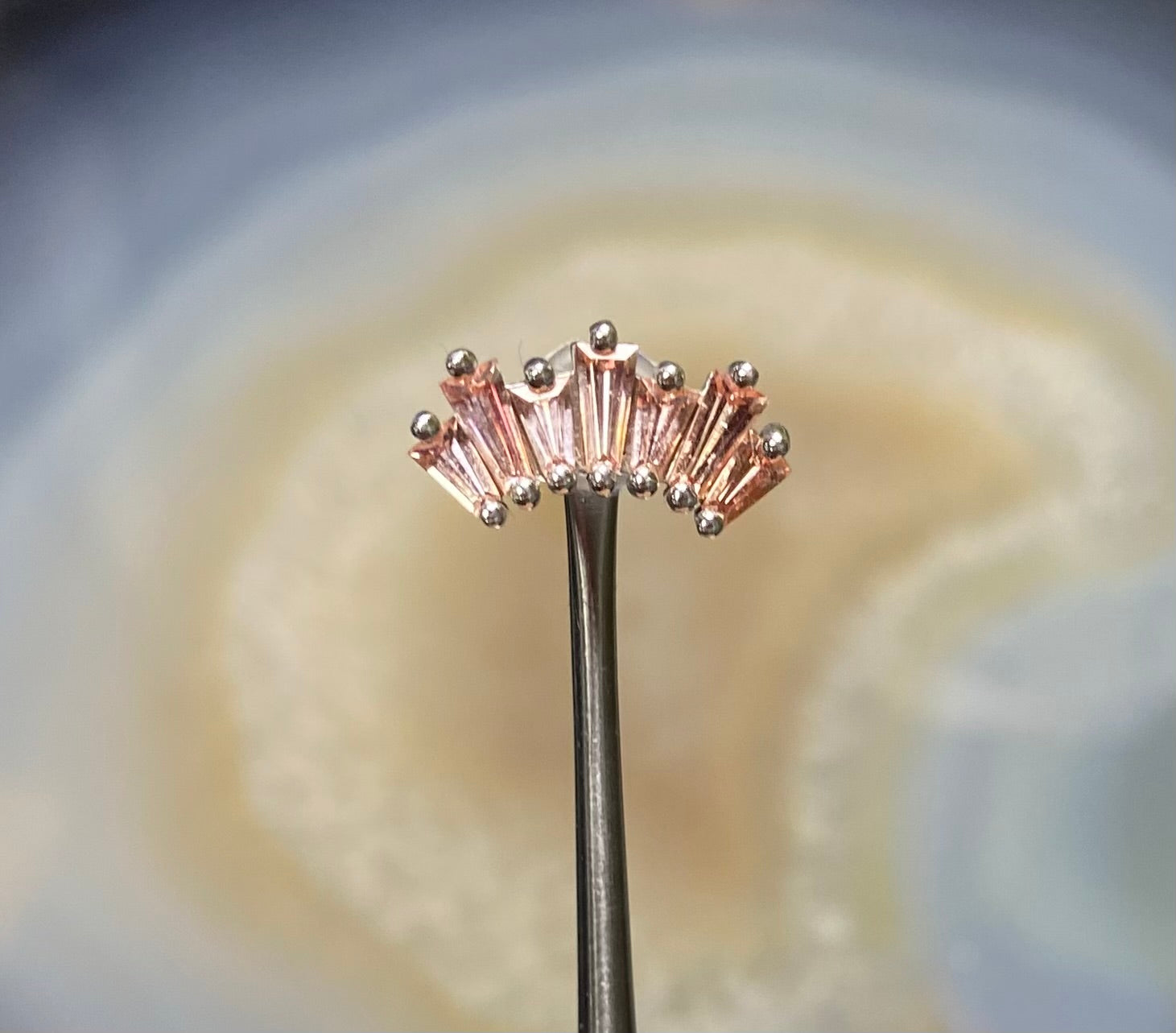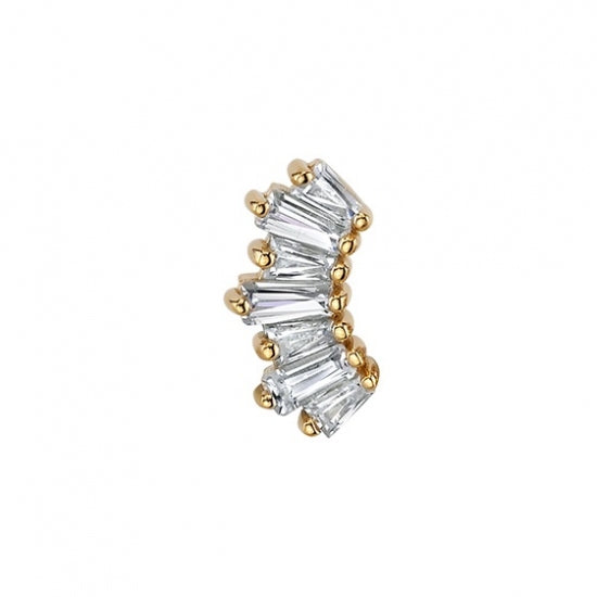 The Oceane 7 by BVLA showcases a sophisticated linear design featuring a graduated row of tapered baguette gemstones. The centerpiece displays an 11x5mm stone, flanked by precisely cut 4x2x1.5mm gems that transition seamlessly into delicate 3x2x1mm accents. This meticulous stone arrangement creates a refined gradient effect, offering versatile styling for various piercing placements. Crafted with BVLA's signature attention to detail, this piece combines geometric elegance with timeless appeal.