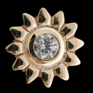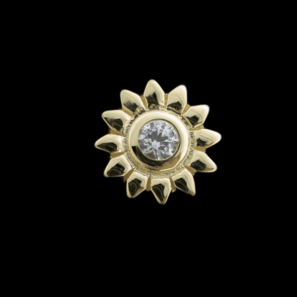Brighten up your style with Helia, the 14KT gold threadless end, featuring a sunflower-inspired design. A sparkling gemstone sits at its center, framed by detailed gold petals.