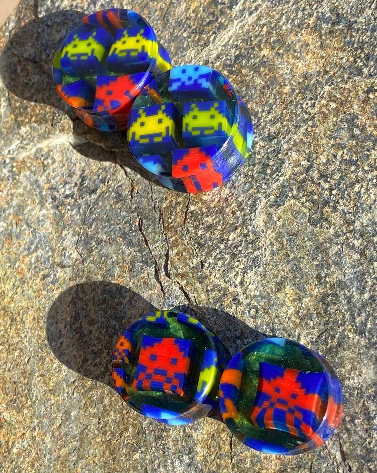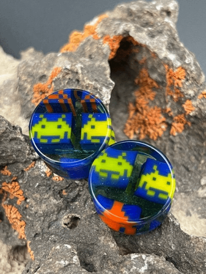 These Double Flared Space Invader Plugs by Gorilla Glass are hand blown from Borosilicate Glass and Feature Space Invaders images in different colors. This design has been discontinued and the remaining stock is very limited!