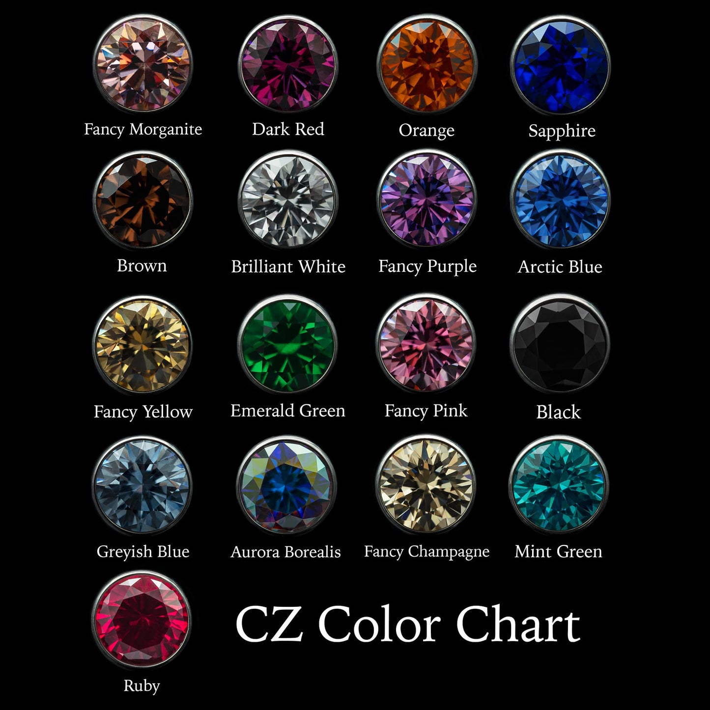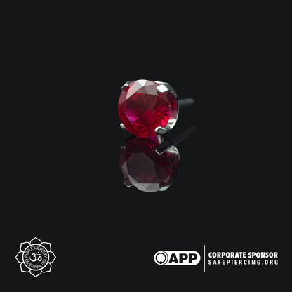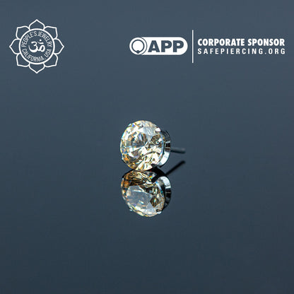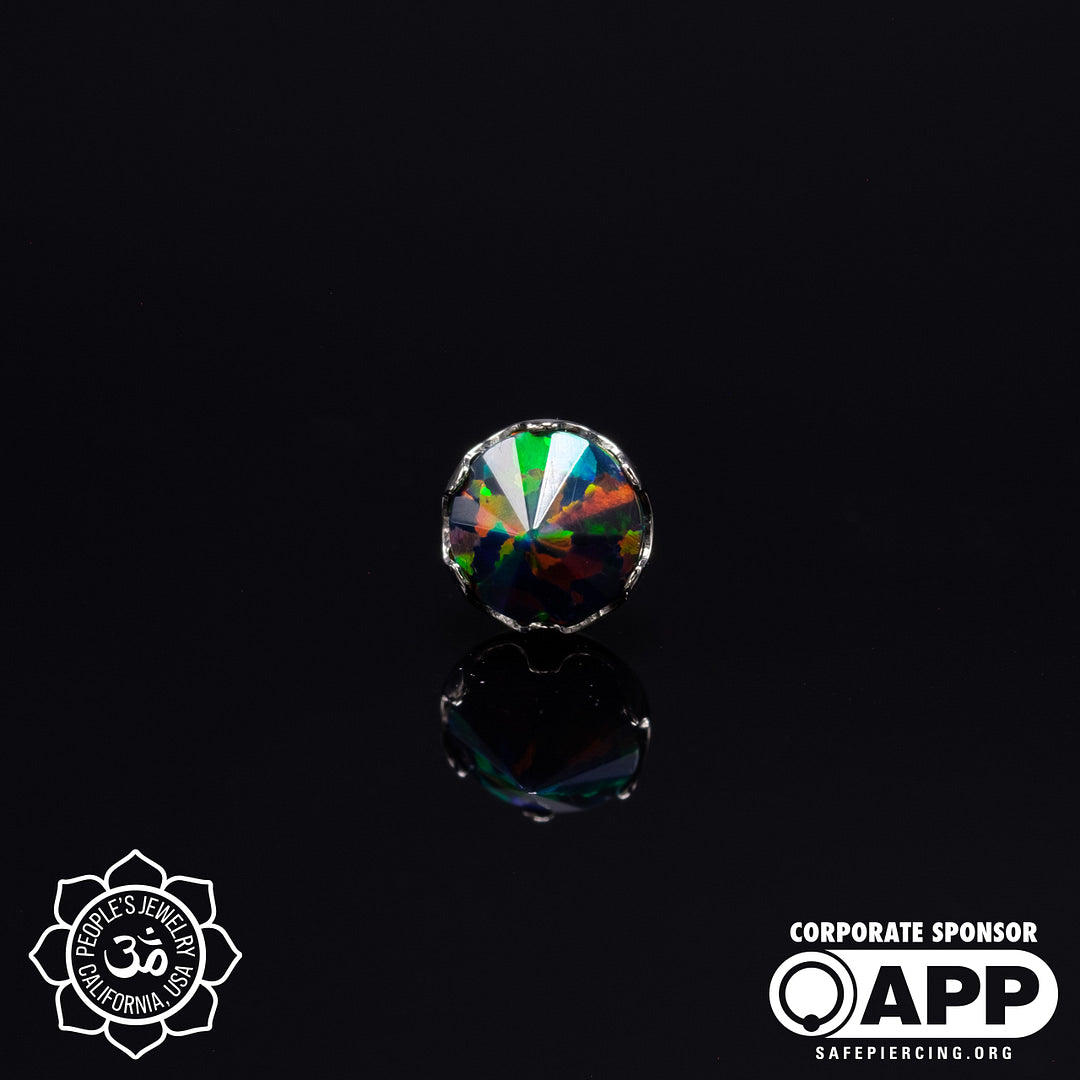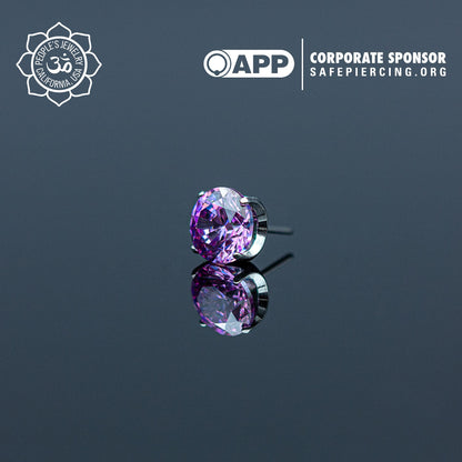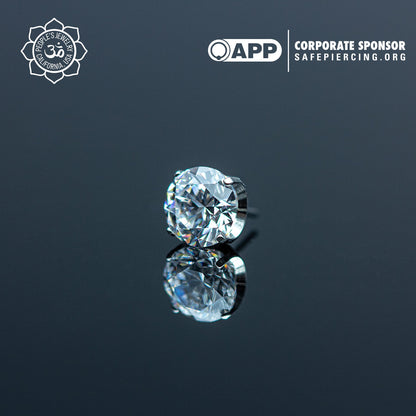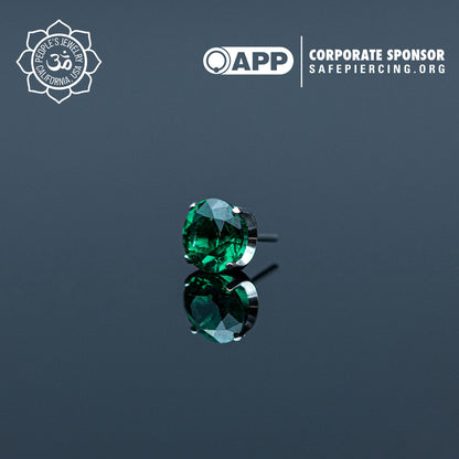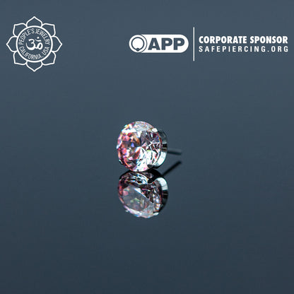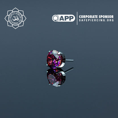These Threadless Inverted Prong-Set Gems by Peoples Jewelry are machined from Solid stock ASTM-F136 implant-grade titanium and hand polished to a mirror finish. They feature hand-set Swarovski gemstones reverse set inside of a titanium prong setting, Giving these a Spiked Gemstone appearance. Available in 21 different colors of Cubic Zirconia and Opals from 2mm to 5mm. Association of Professional Piercers Approved and Verified.