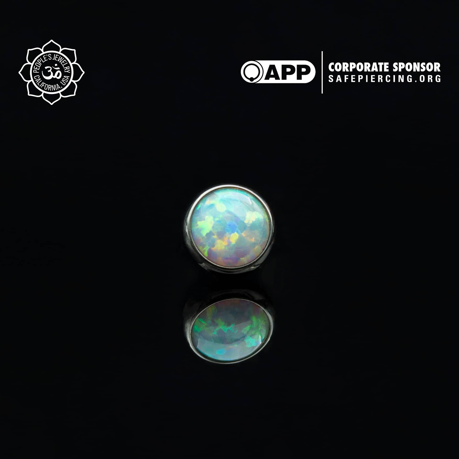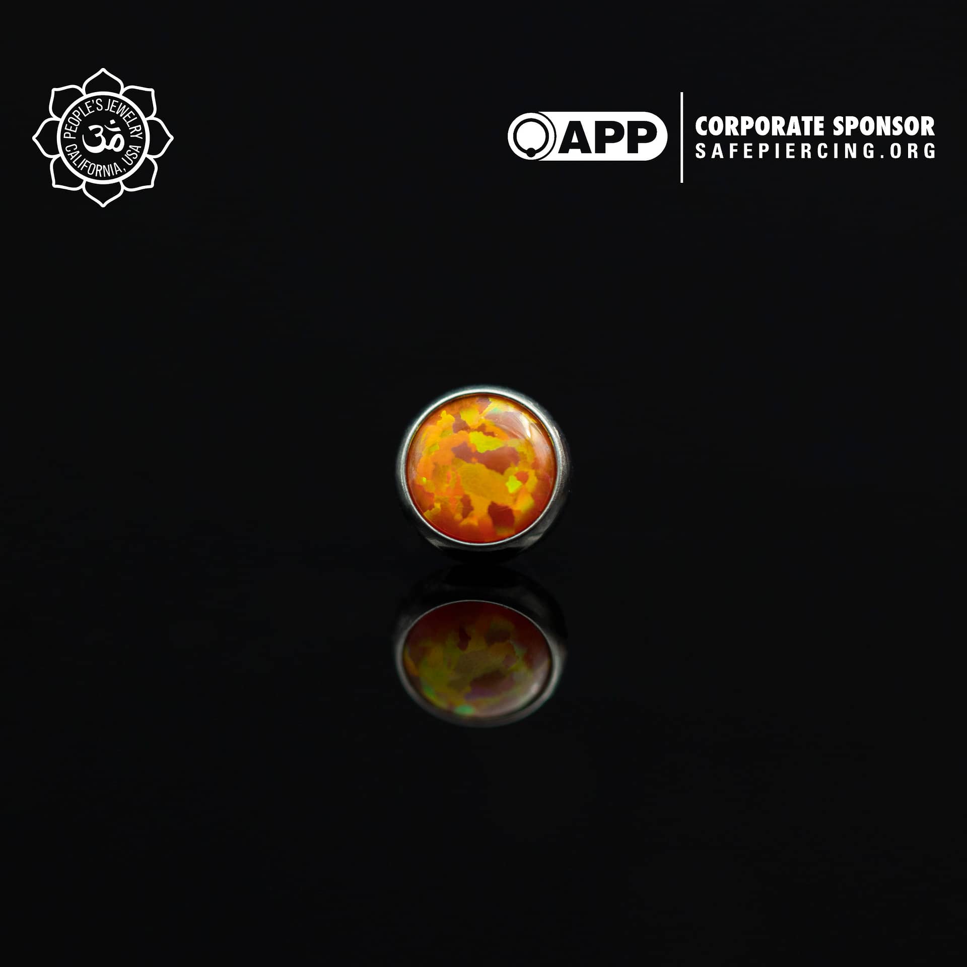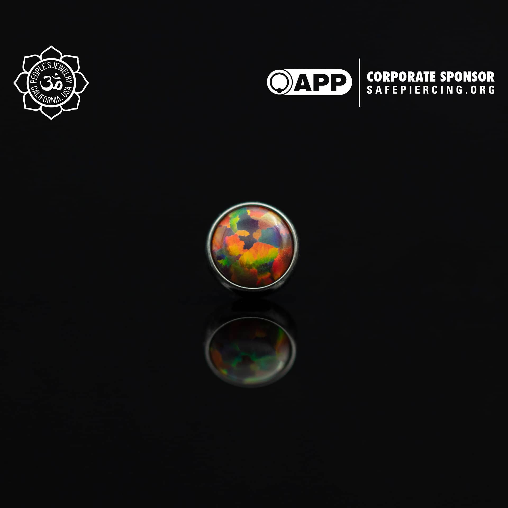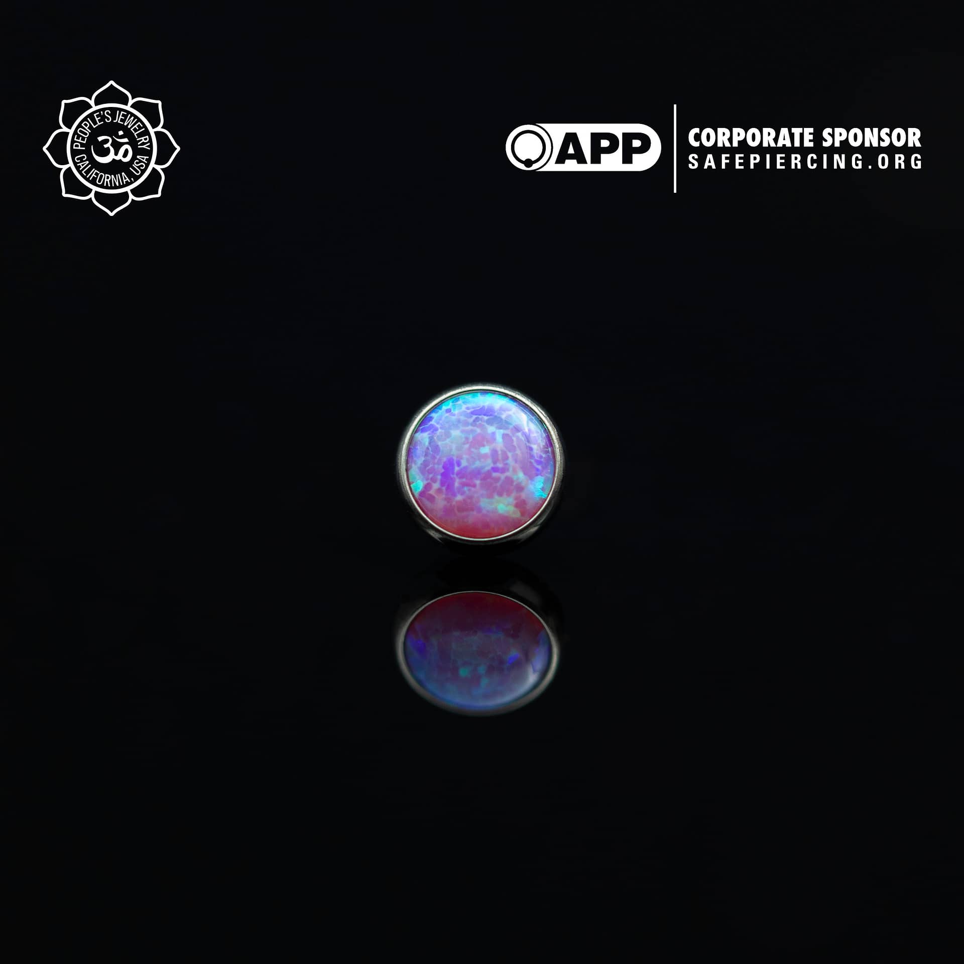 These Threadless Opal Cabochon Ends by Peoples Jewelry are machined from Solid stock ASTM-F136 implant-grade titanium and hand-polished to a mirror finish. Each Opal is hand-set to perfection. Available in 20 different Synthetic Opal Colors from 2mm up to 5mm. Association of Professional Piercers Approved and Verified.