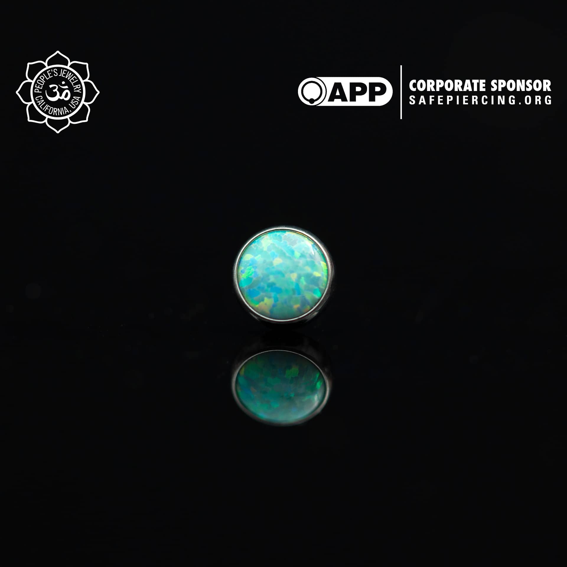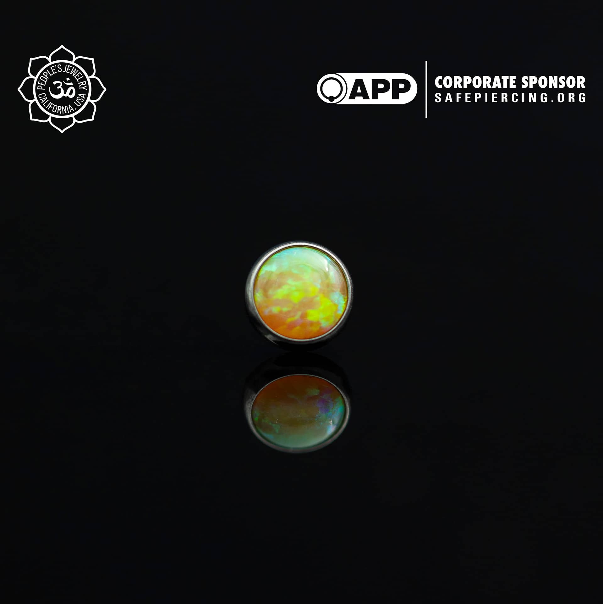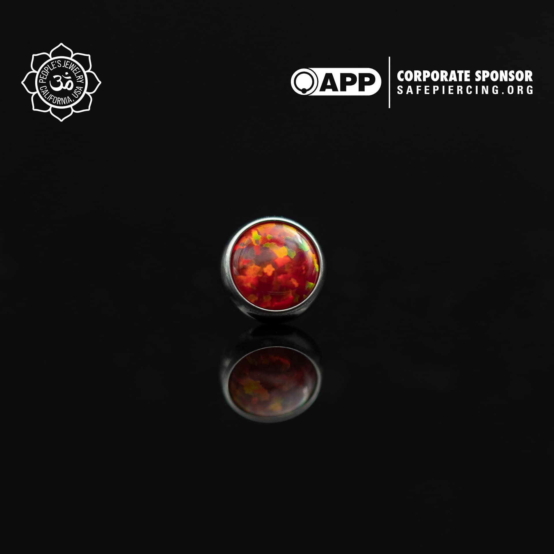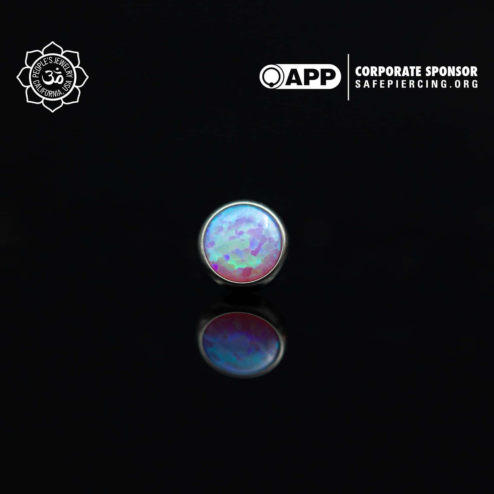 These Threadless Opal Cabochon Ends by Peoples Jewelry are machined from Solid stock ASTM-F136 implant-grade titanium and hand-polished to a mirror finish. Each Opal is hand-set to perfection. Available in 20 different Synthetic Opal Colors from 2mm up to 5mm. Association of Professional Piercers Approved and Verified.
