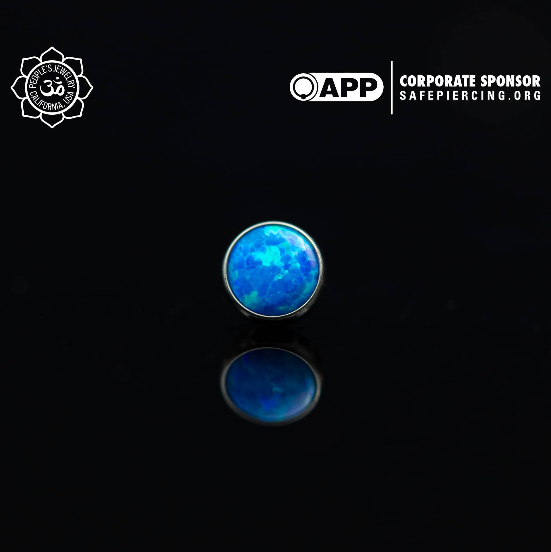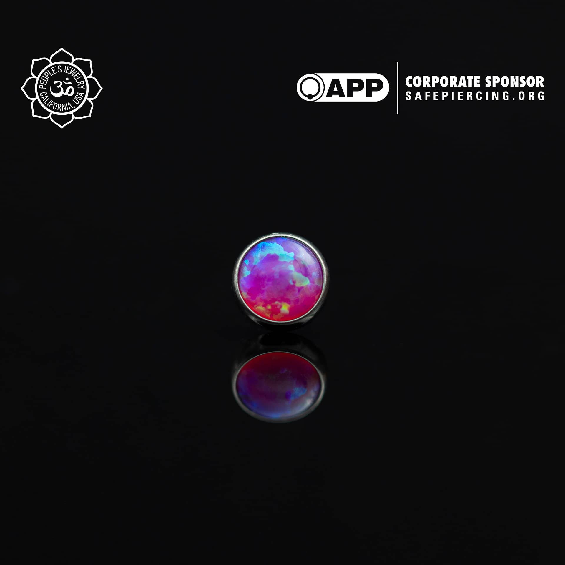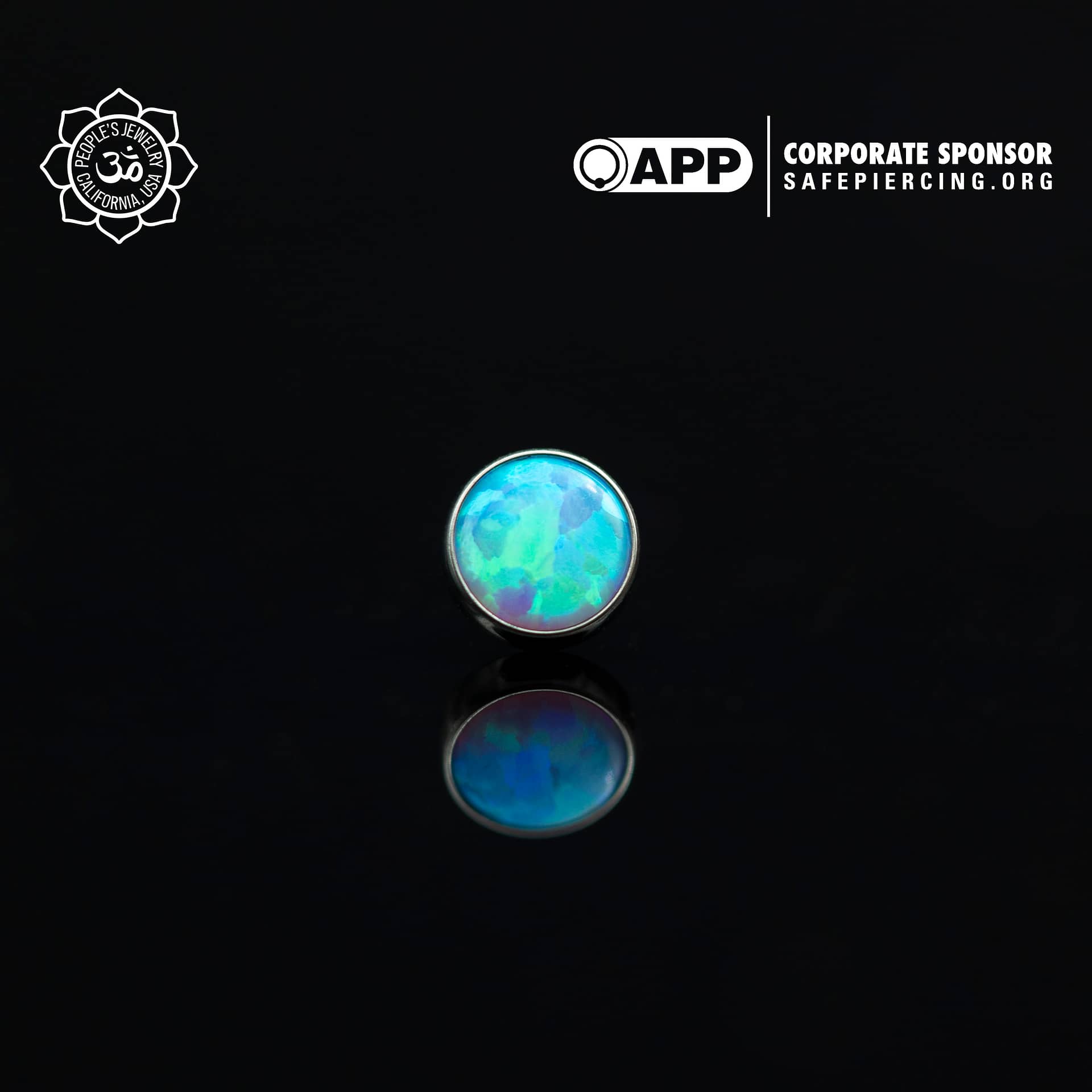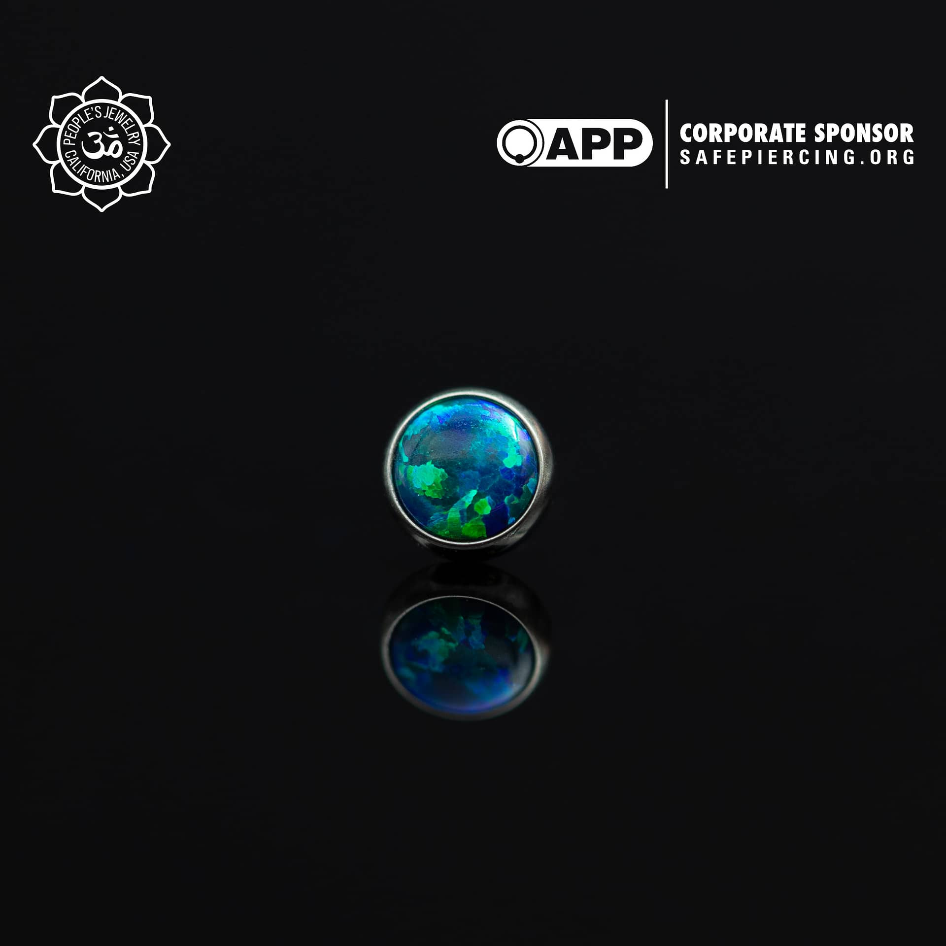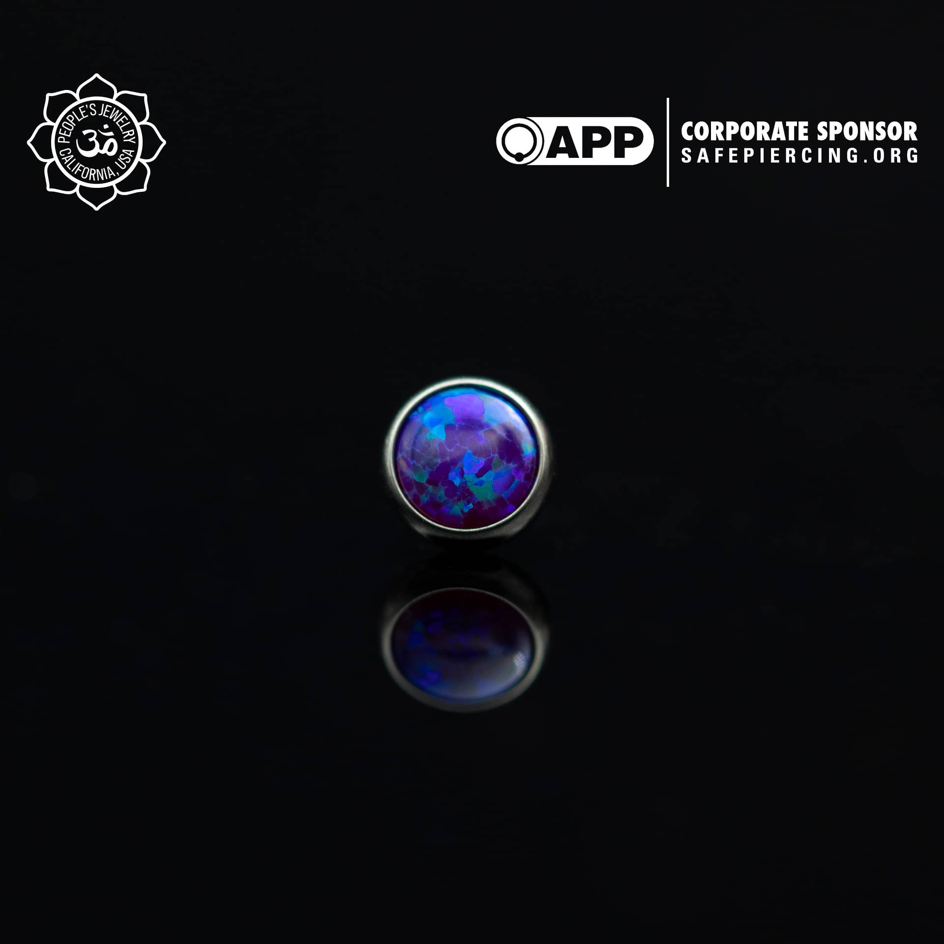 These Threadless Opal Cabochon Ends by Peoples Jewelry are machined from Solid stock ASTM-F136 implant-grade titanium and hand-polished to a mirror finish. Each Opal is hand-set to perfection. Available in 20 different Synthetic Opal Colors from 2mm up to 5mm. Association of Professional Piercers Approved and Verified.