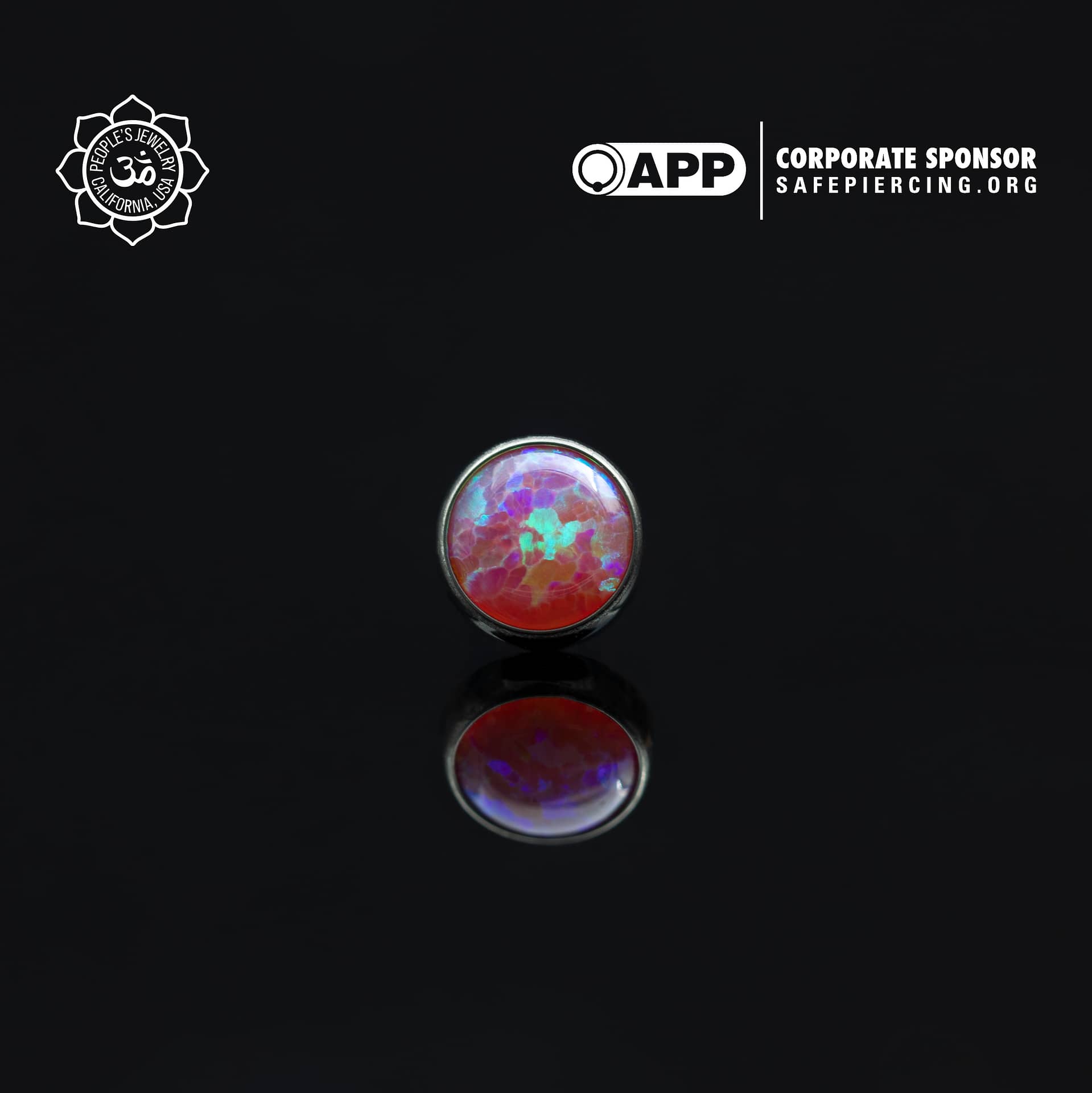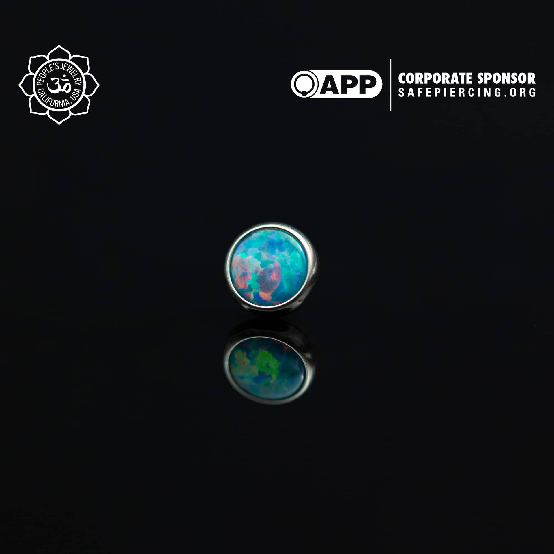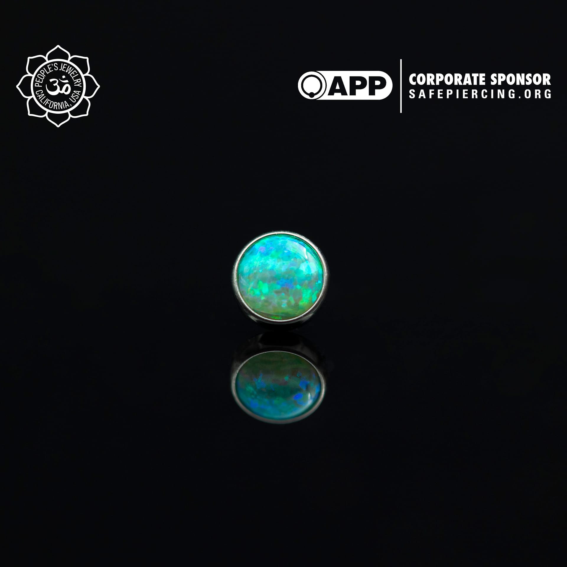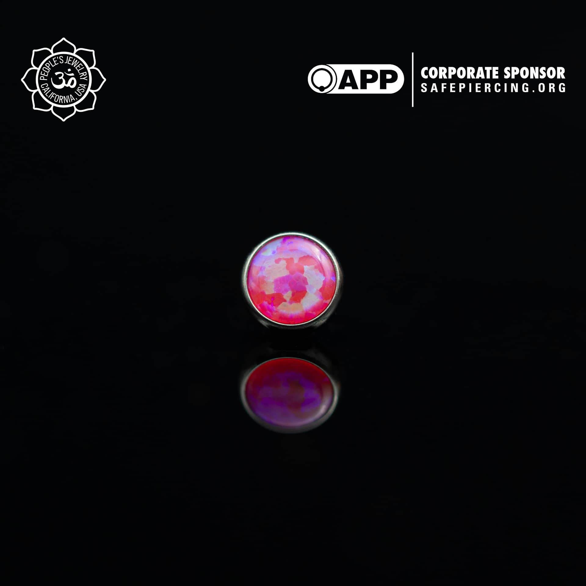 These Threadless Opal Cabochon Ends by Peoples Jewelry are machined from Solid stock ASTM-F136 implant-grade titanium and hand-polished to a mirror finish. Each Opal is hand-set to perfection. Available in 20 different Synthetic Opal Colors from 2mm up to 5mm. Association of Professional Piercers Approved and Verified.