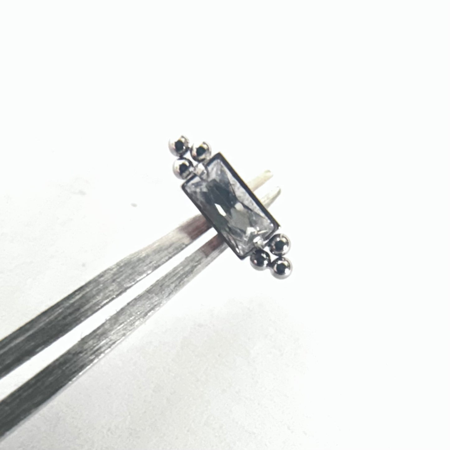 Threadless Titanium Beaded Rectangular Gem is 8mm L x 2mm W and includes a rectangular clear CZ and a tri-bead on each end. This piece does not include the post and must be purchased separately.