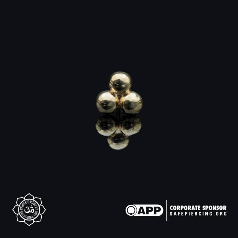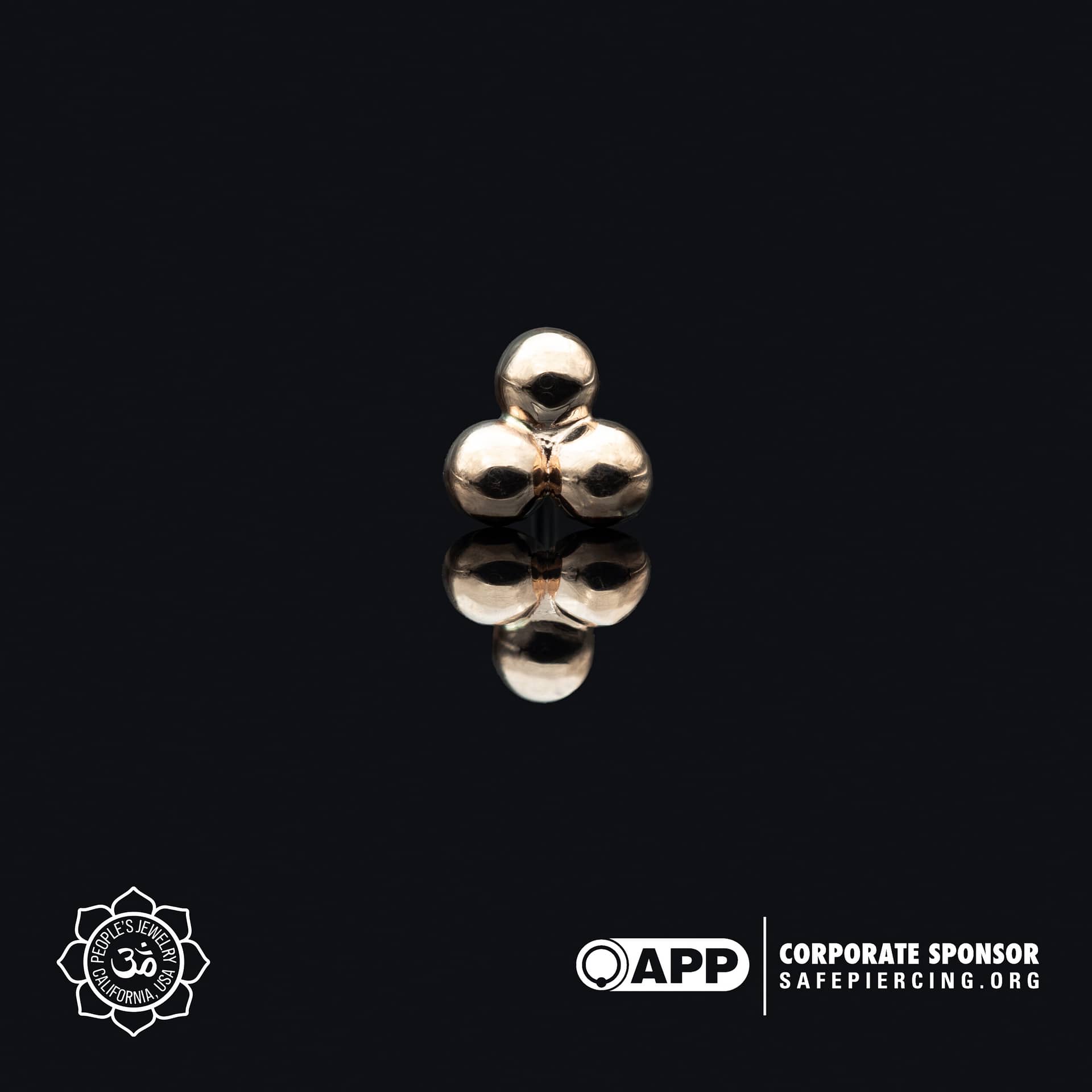 These Threadless Tri-Bead Ends by Peoples Jewelry are hand-crafted from solid 14k Gold. These Three Bead Clusters are available in 3mm and 4mm in both Yellow and Rose Gold. These Threadless pieces feature a stainless steel universal Threadless Pin on the back.