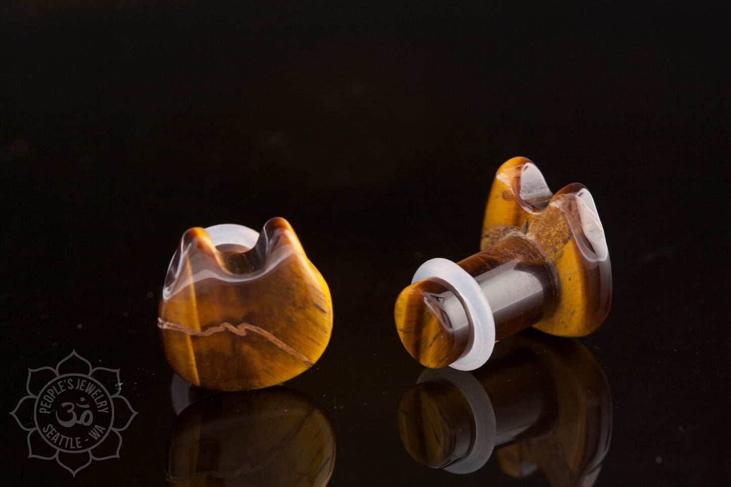 These Single Flare Yellow Tigers Eye Kitties by Peoples Jewelry are hand-carved from genuine yellow tiger's eye. Ranging in sizes from 2g (6mm) up to 5/8″ (16mm), each pair comes with medical-grade silicone O rings for added security.